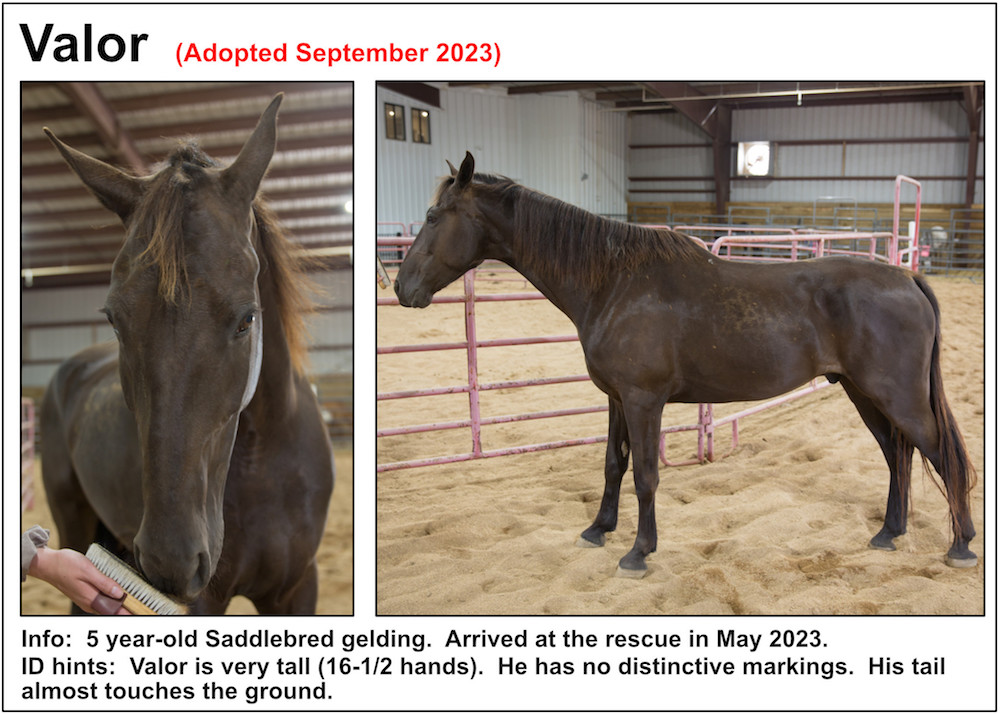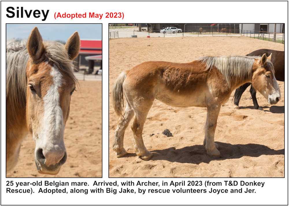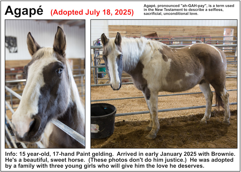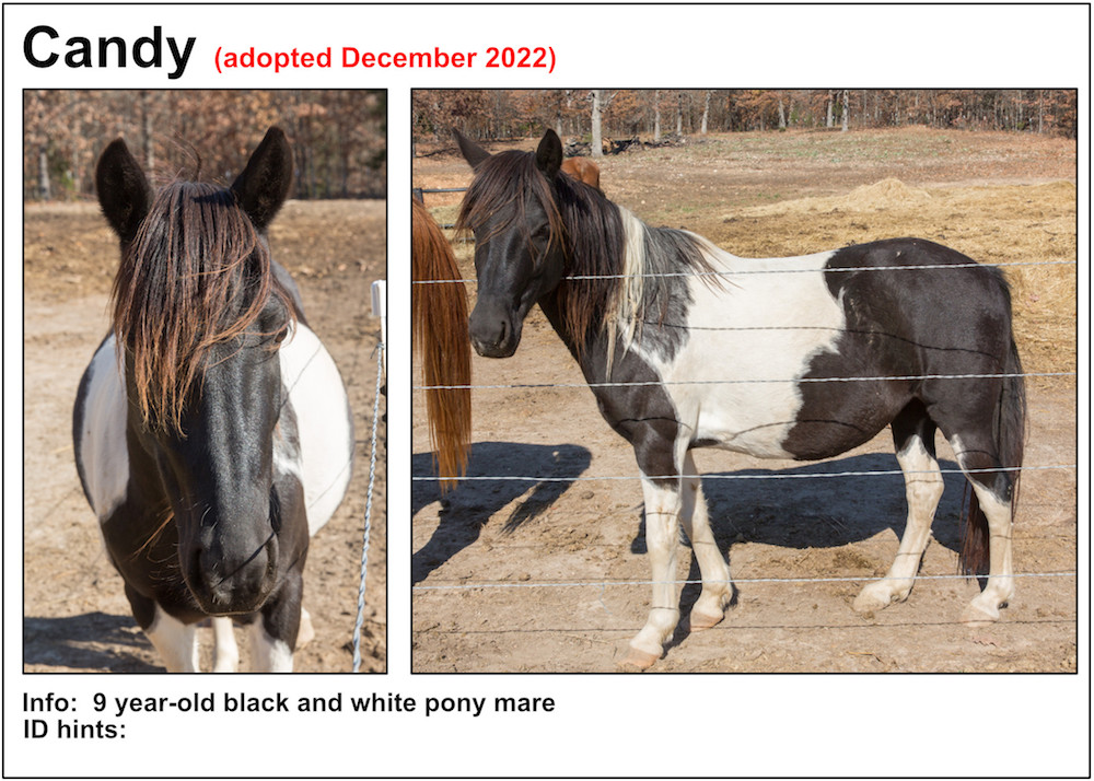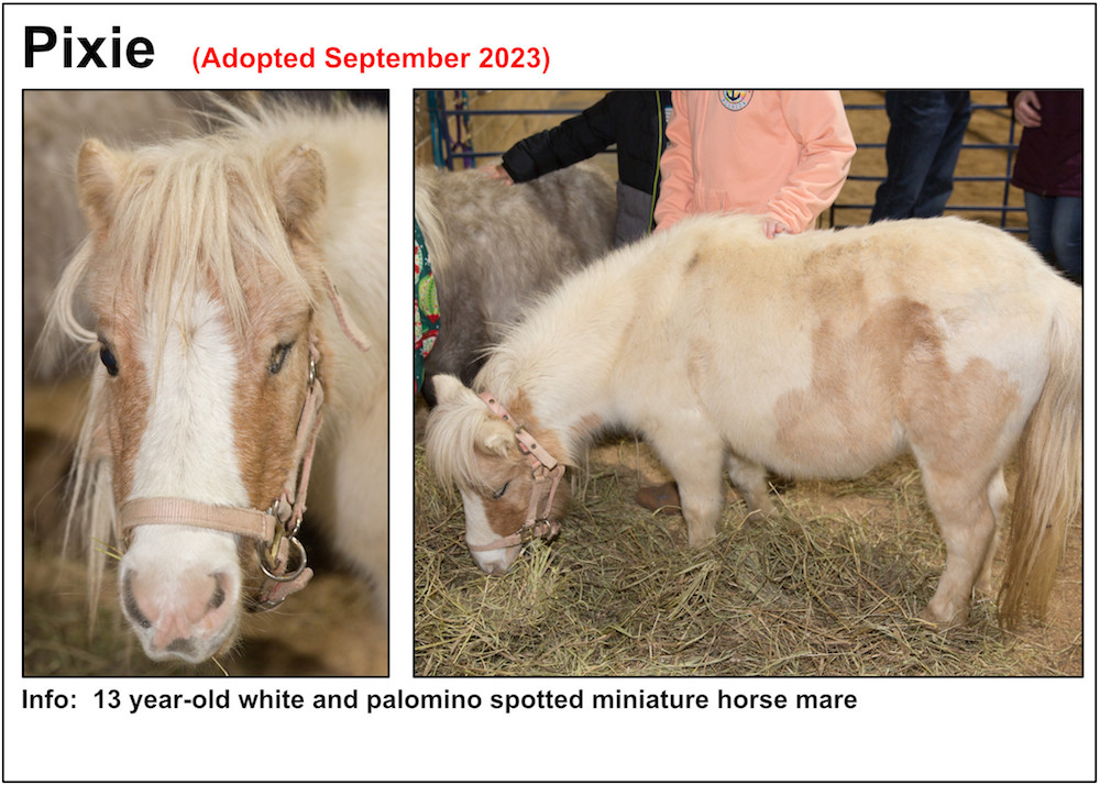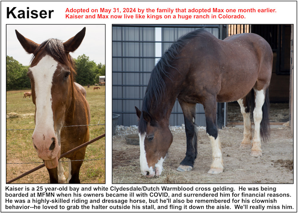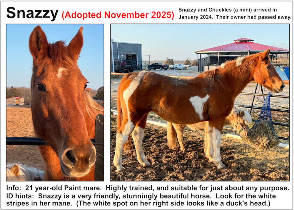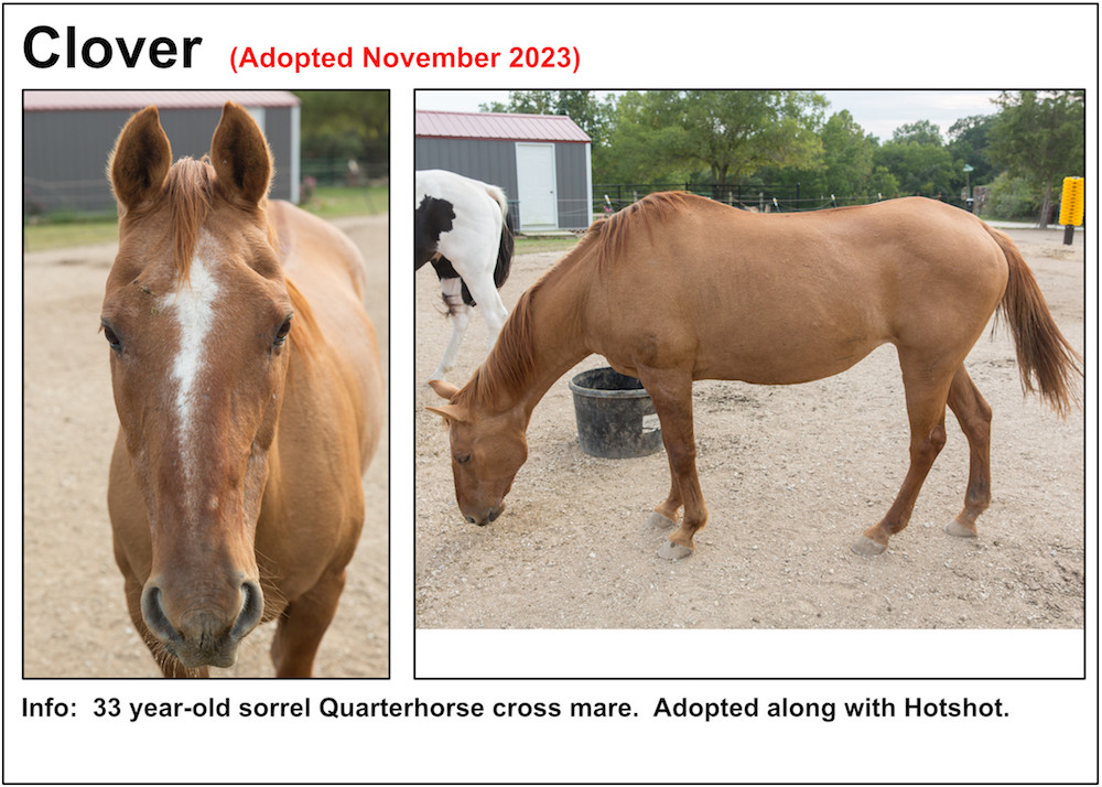 Other adopted horses, for whom photos aren't available: Dude (adopted by Dr. Bell & family)