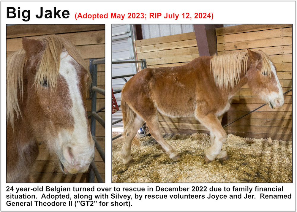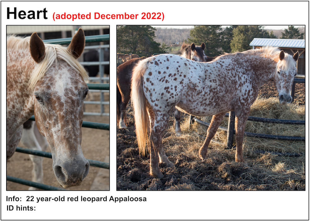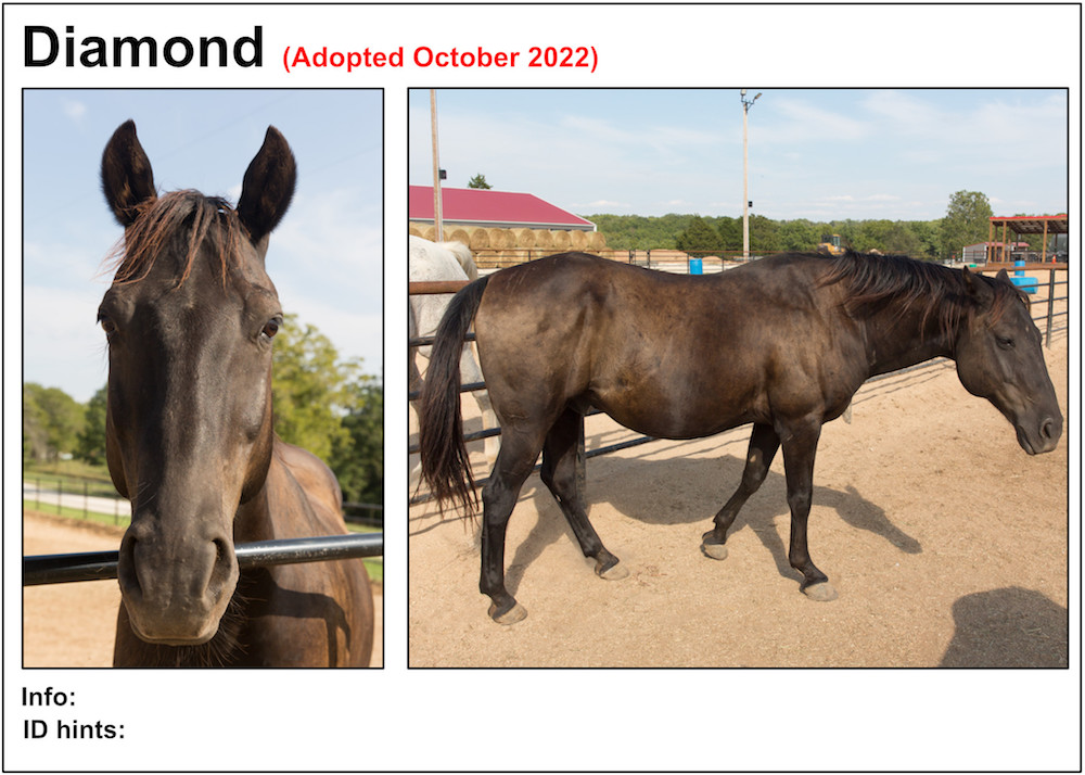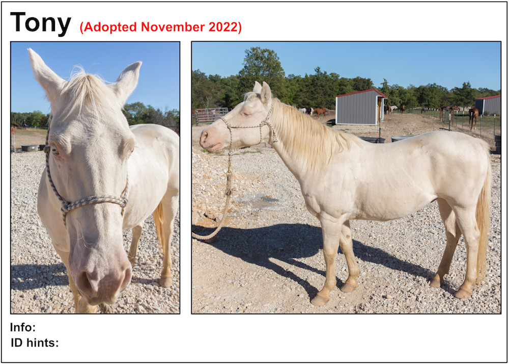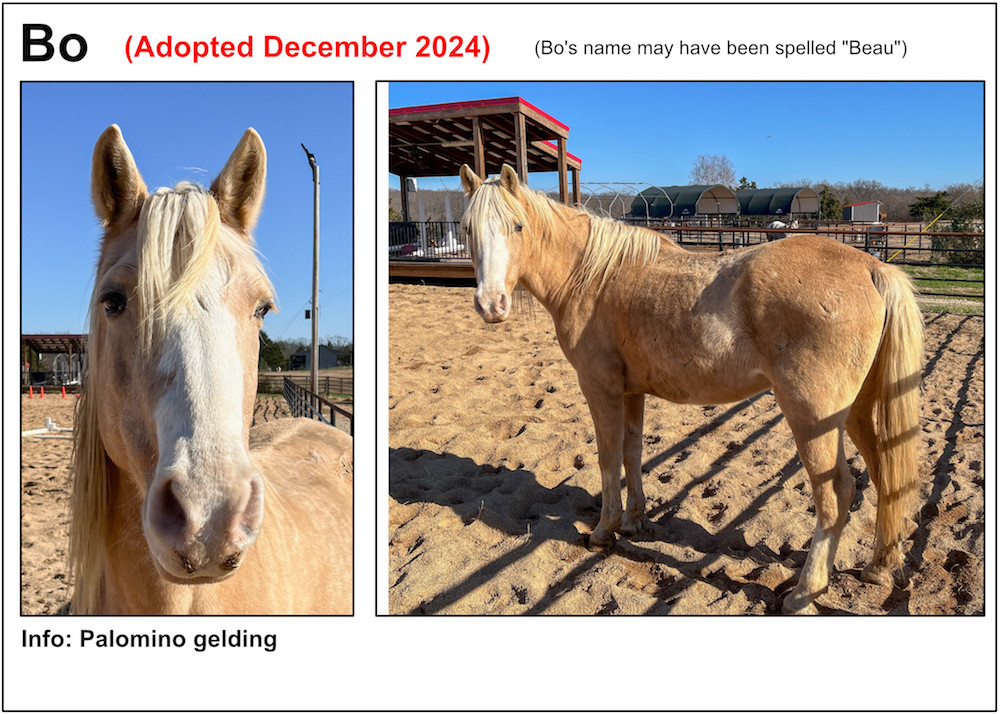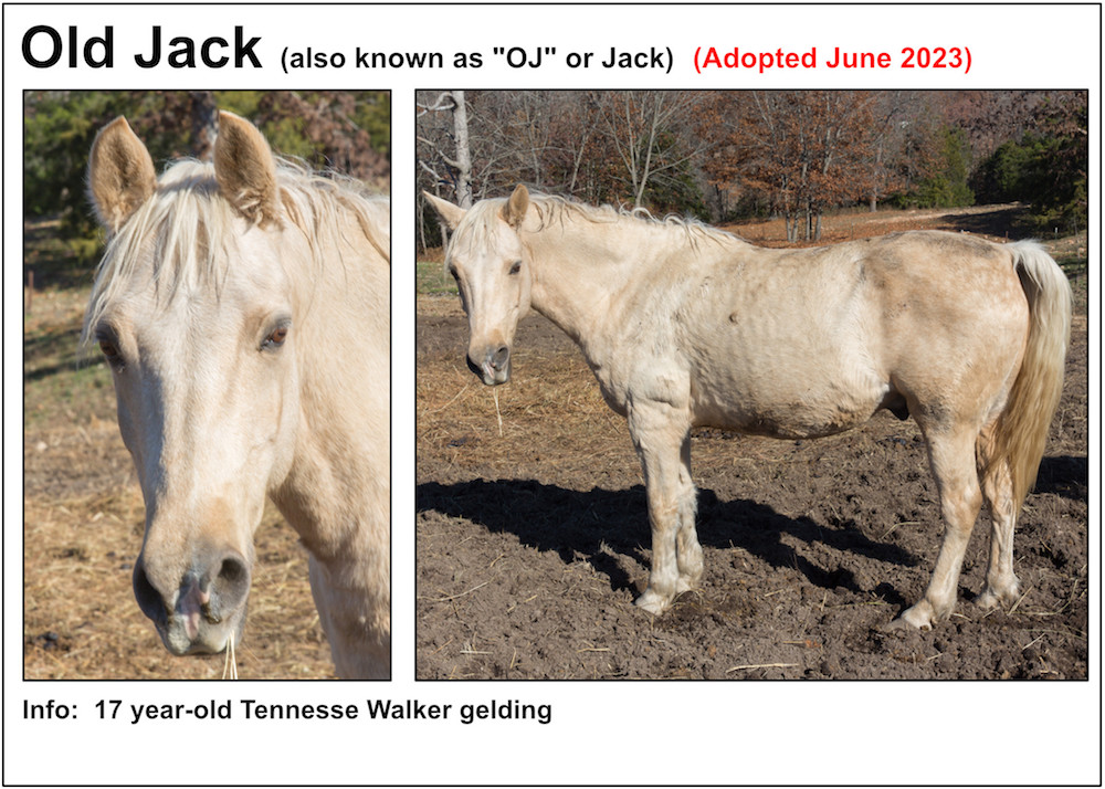 I only have photos of those horses that were adopted beginning in late 2022. If you have a photo of a horse that was adopted prior to then and would like to have it remembered here, please send it to jim@gojim.tv