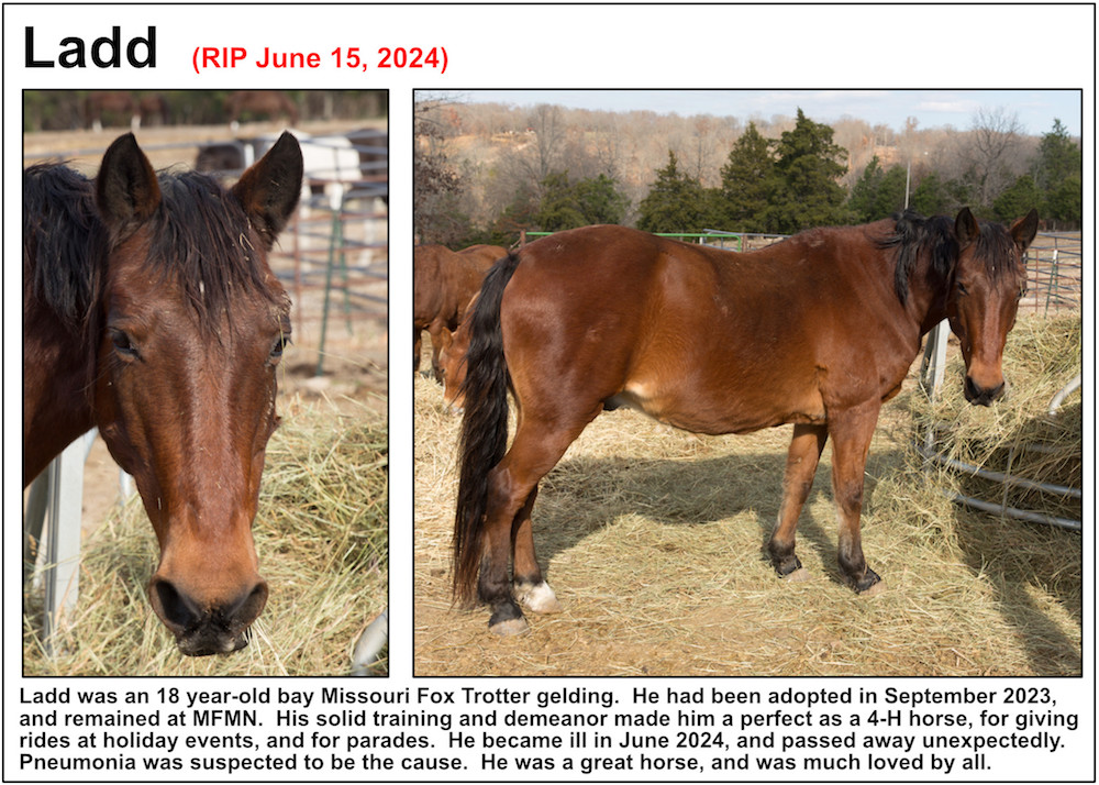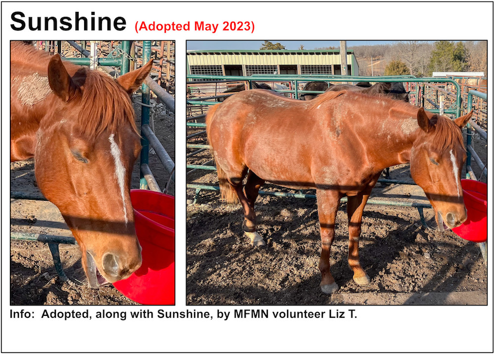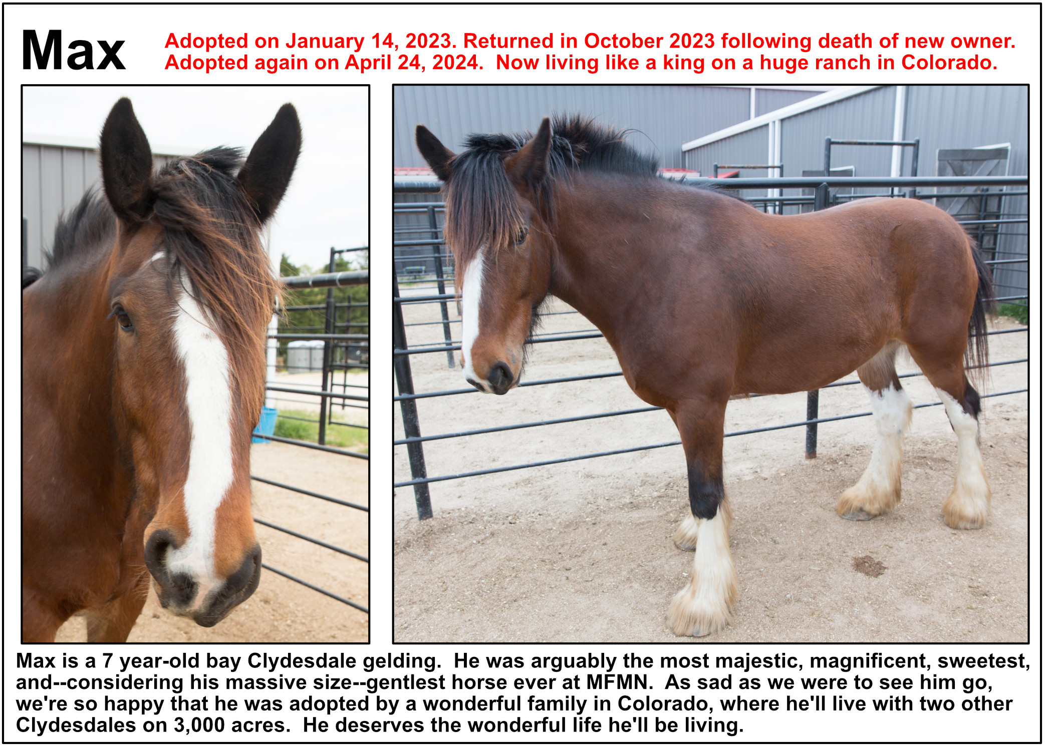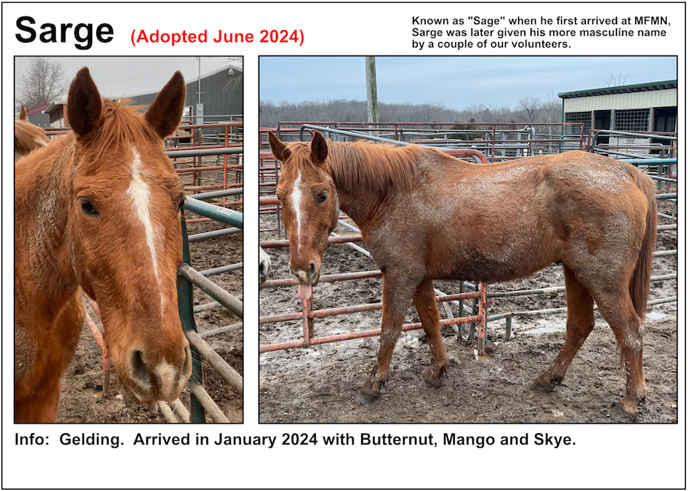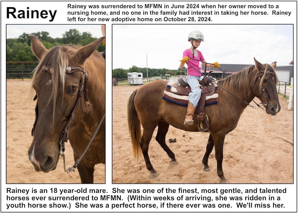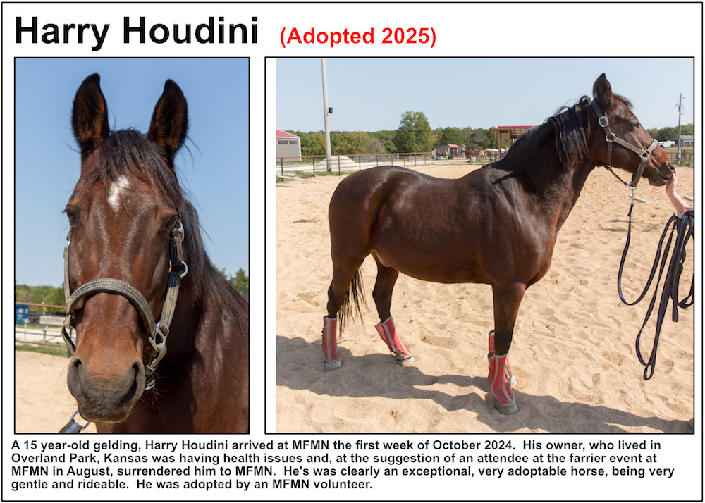This page is intended to help remember those horses that were adopted and are no longer at the rescue. Thus, horses that have been adopted, but are being boarded at MFMN, are not included on this page.