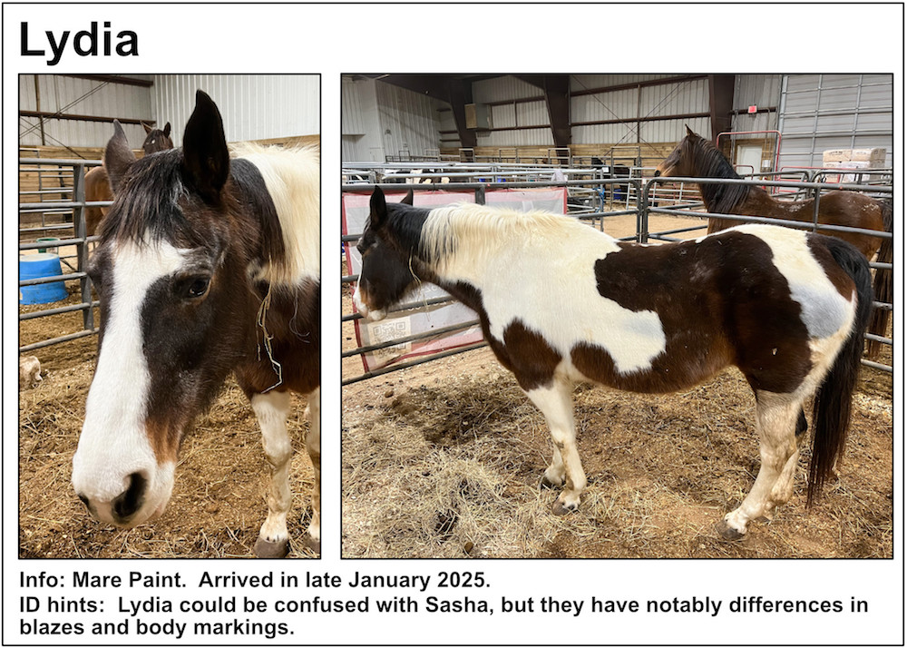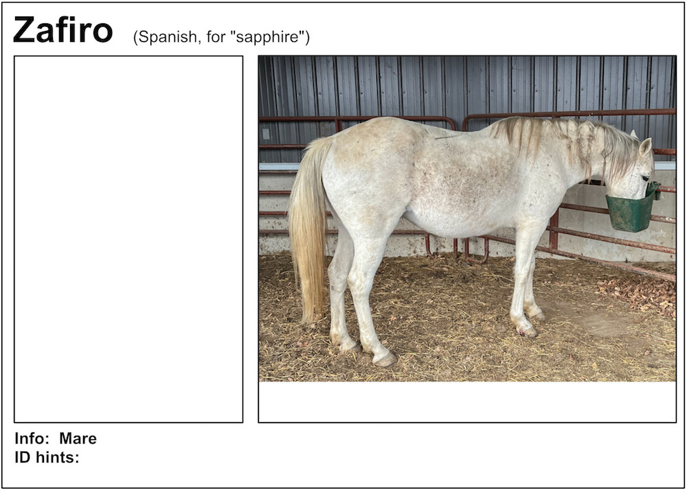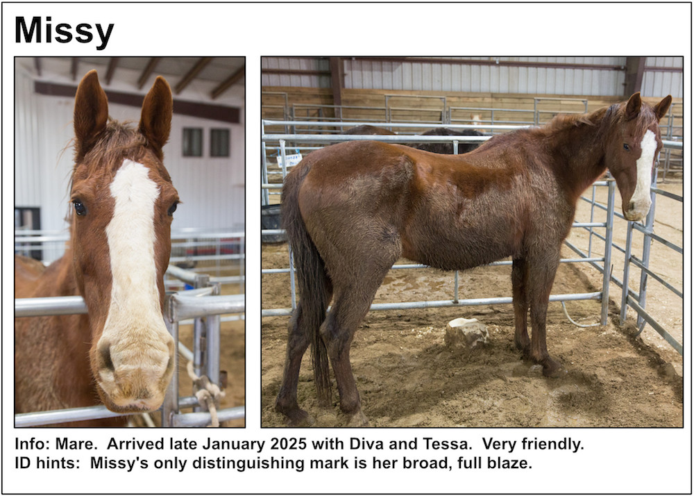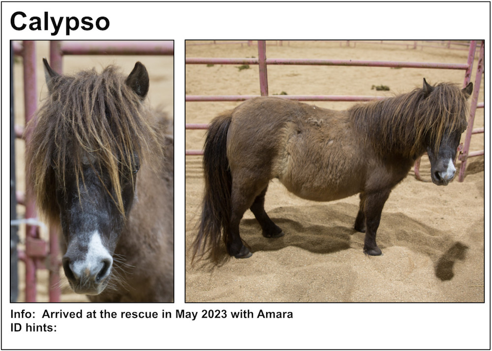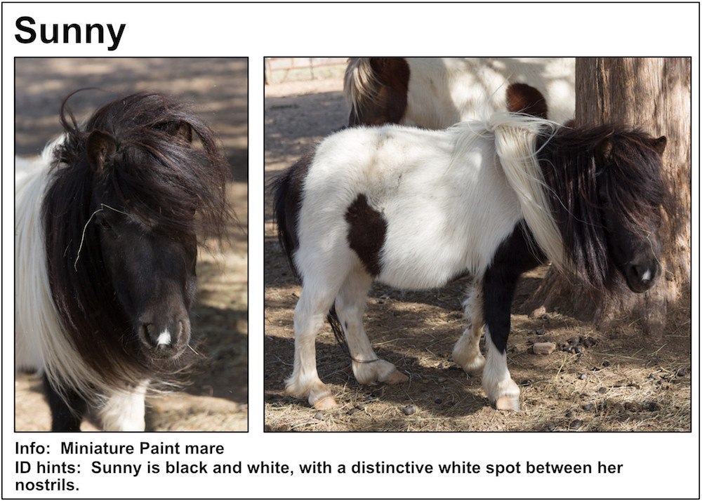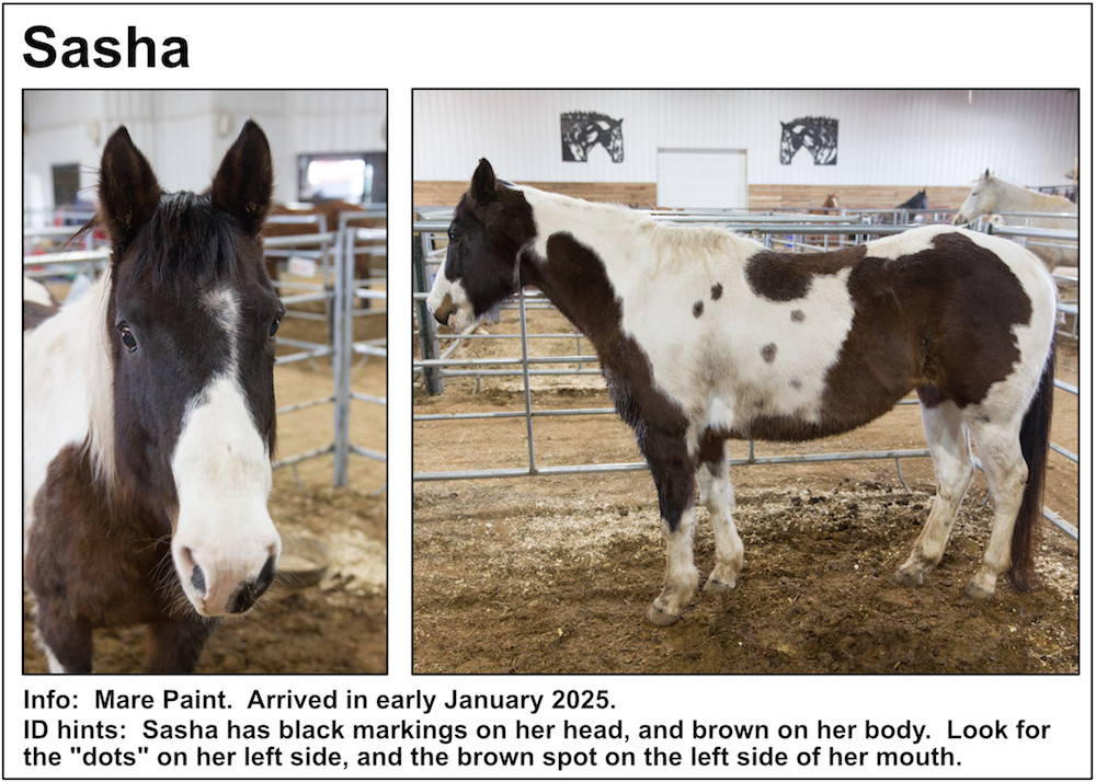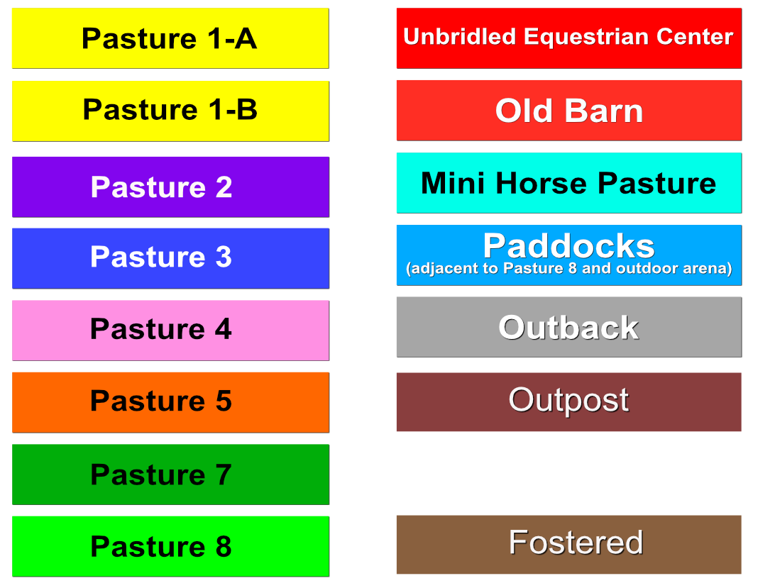 If you’re near a pasture, or are in our Unbridled Equestrian Center, and want to identify a horse within, this may be your fastest route to identification. Please be aware that these listings will almost certainly be slightly out-of-date due to horses that have just arrived or have been adopted out, as well as for horses that have been moved from from one pasture to another.