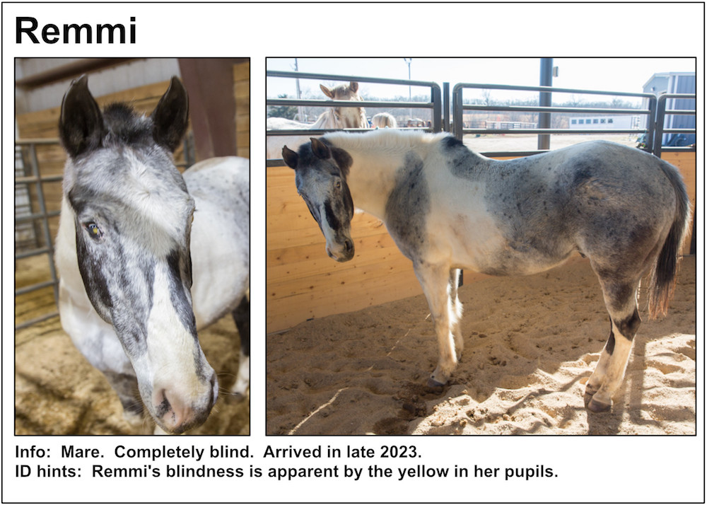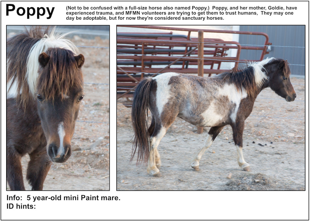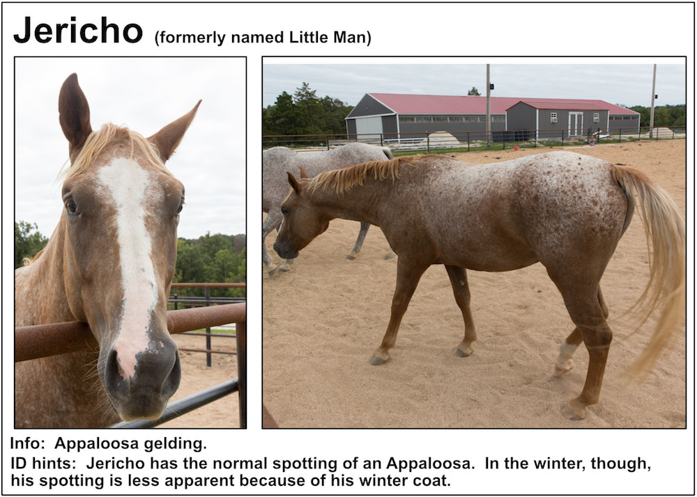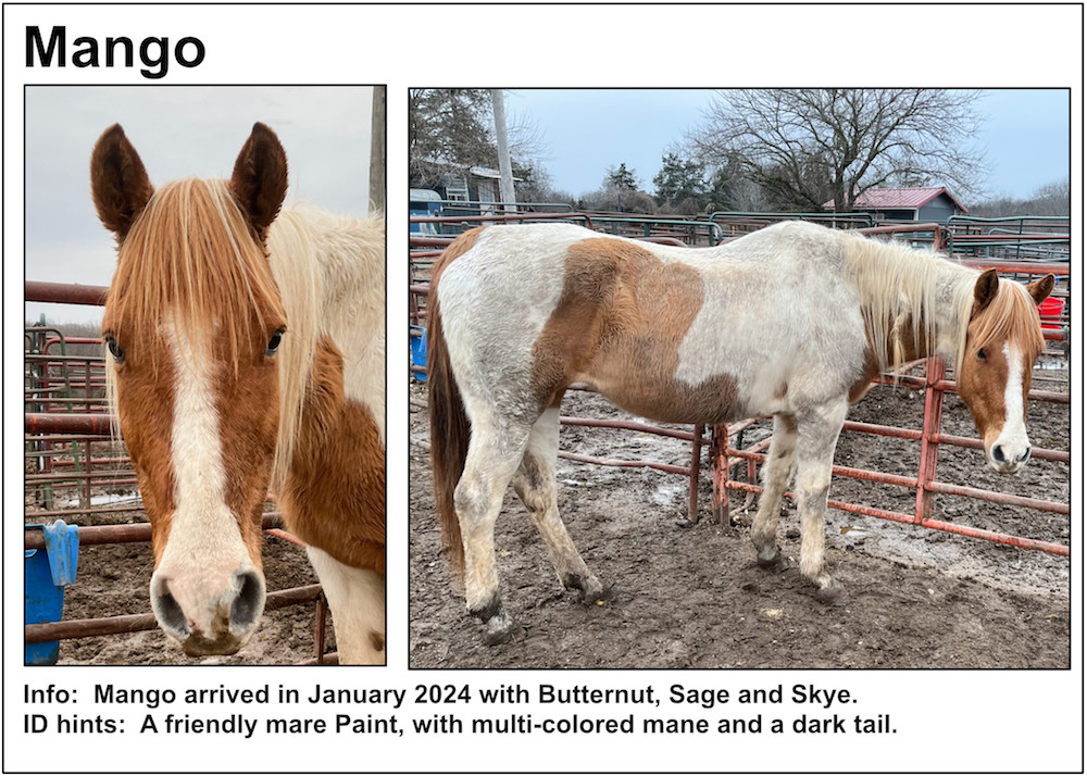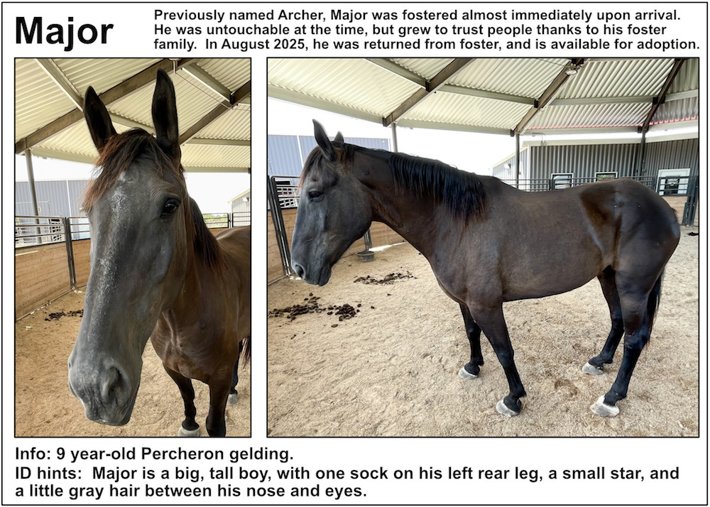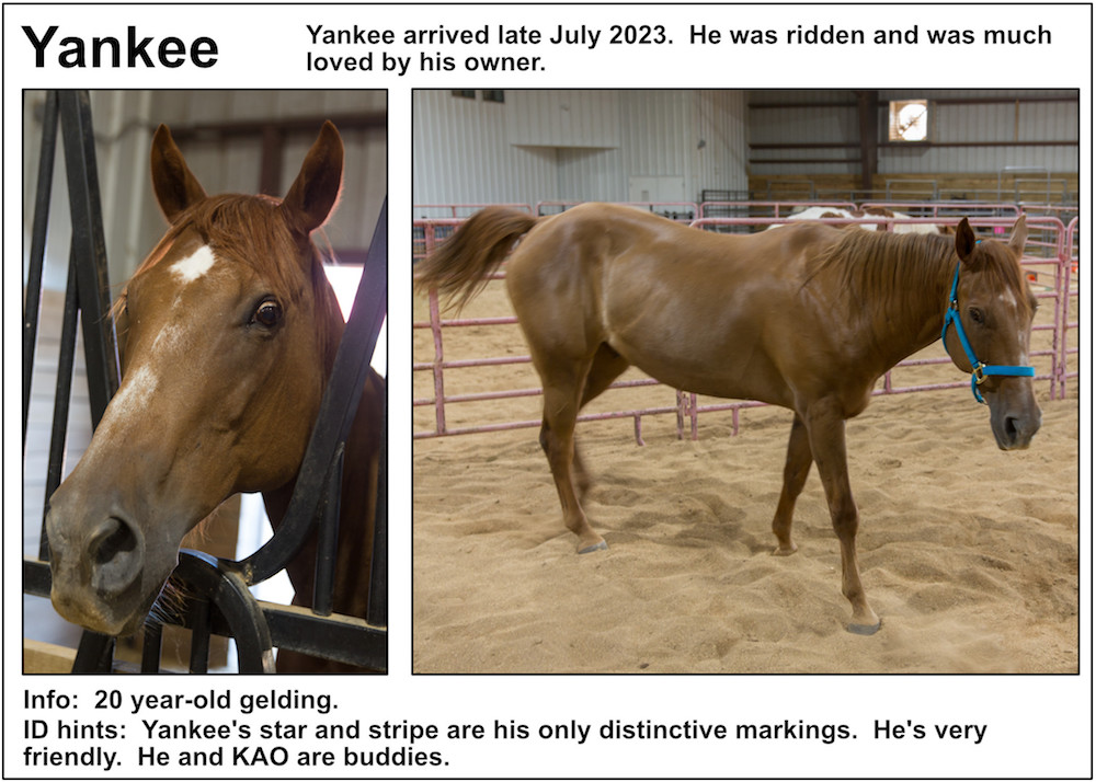 If you’re near a pasture, or are in our Unbridled Equestrian Center, and want to identify a horse within, this may be your fastest route to identification. Please be aware that these listings will almost certainly be slightly out-of-date due to horses that have just arrived or have been adopted out, as well as for horses that have been moved from from one pasture to another.
