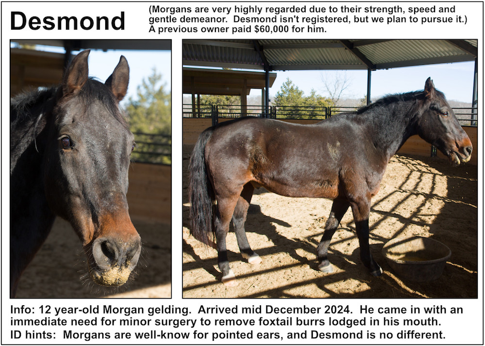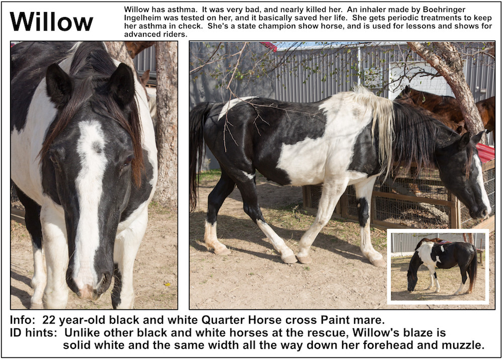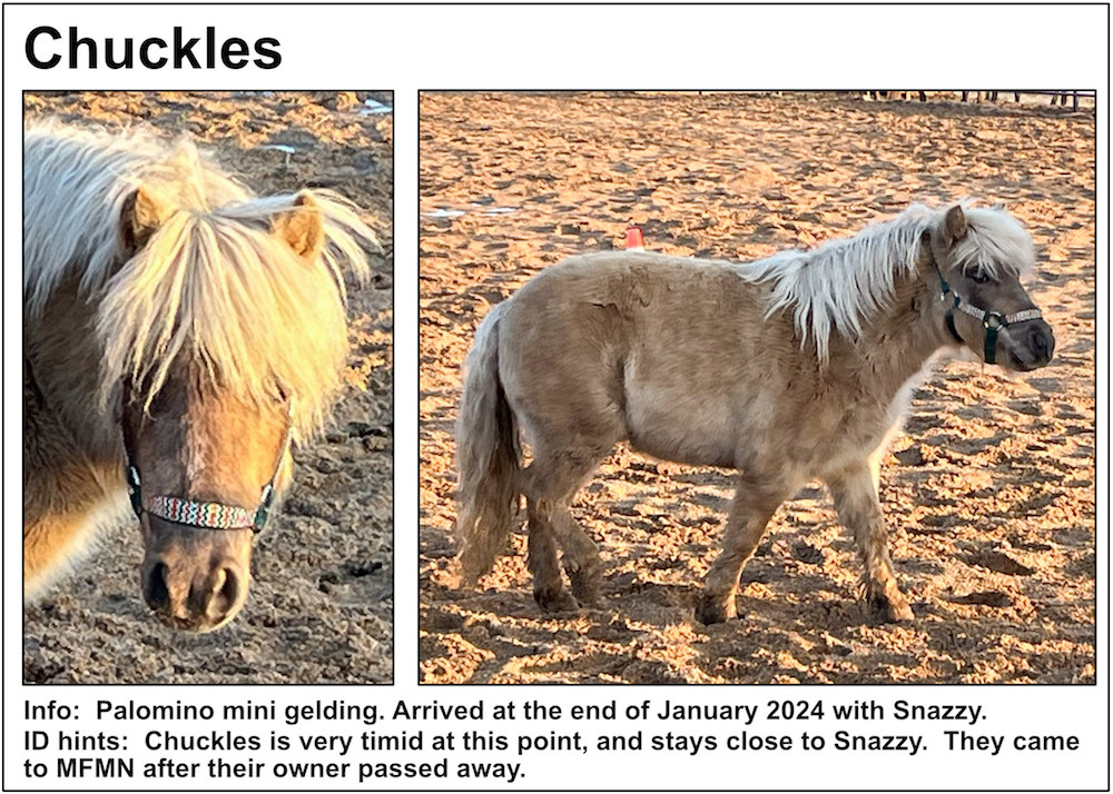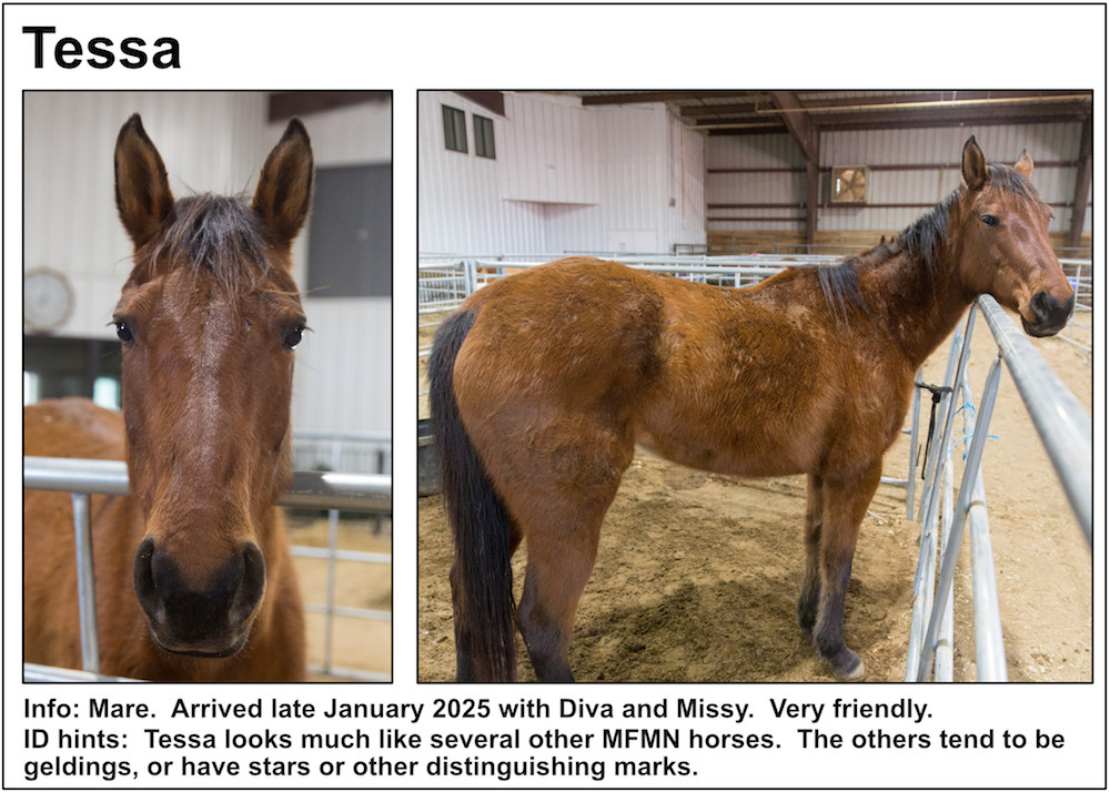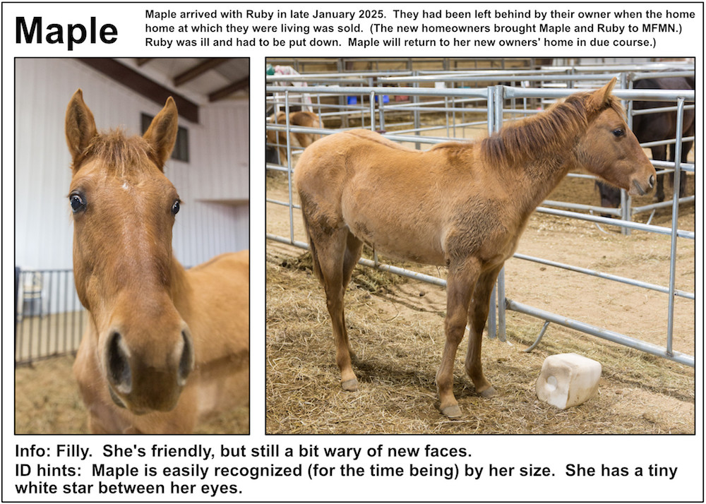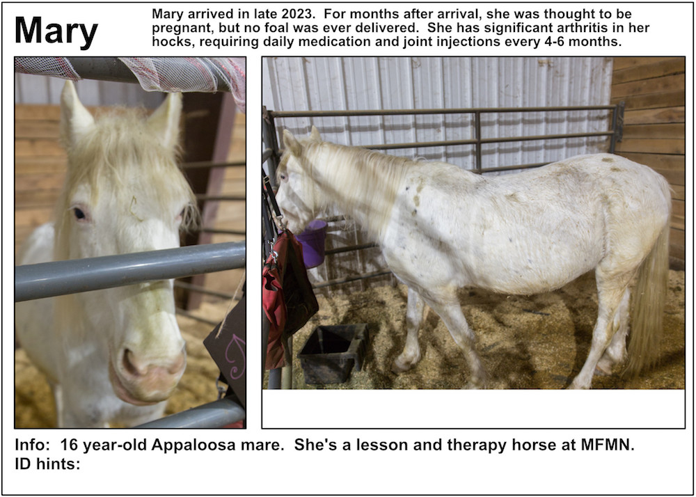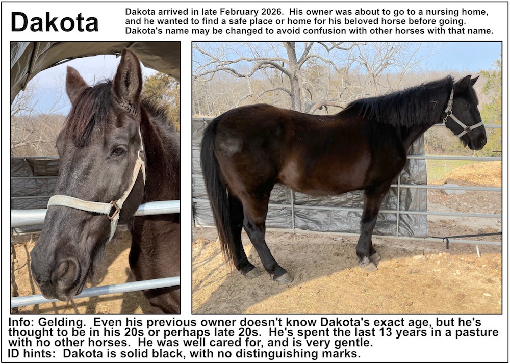 If you’re near a pasture, or are in our Unbridled Equestrian Center, and want to identify a horse within, this may be your fastest route to identification. Please be aware that these listings will almost certainly be slightly out-of-date due to horses that have just arrived or have been adopted out, as well as for horses that have been moved from from one pasture to another.